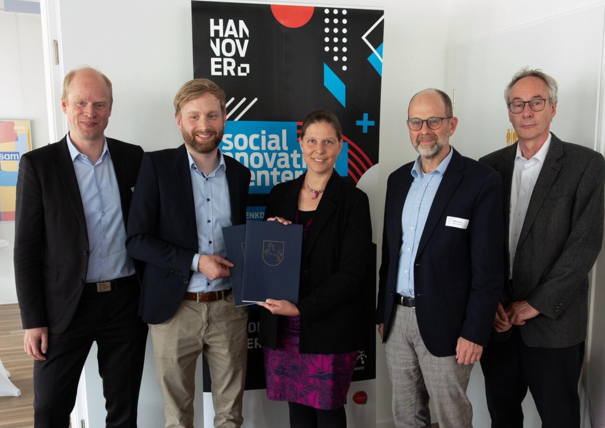 Hildesheim PULS, 4. Juni 2024 - Die Ministerin für Bundes- und Europaangelegenheiten und Regionale Entwicklung Wiebke Osigus übergibt beim Kick Off des Social Innovation Center im PULS Hildesheim den Förderbescheid an Raphael von Galen. Es gratulieren die Mitglieder der Steuerungsgruppe Walter Hansen (Dezernent für Bildung, Kultur und Bau des Landkreises Hildesheim), Malte Spitzer (Erster Stadtrat...